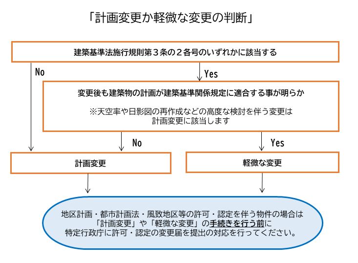 ただし、建築物等の変更部分が下記の各号いづれかに該当し、当該変更及び当該変更に伴い付随的に生じる変更が他の号に該当しない場合であっても、変更後の計画が建築基準関係規定に適合することが明らかなものであれば、「軽微な変更」の対象となります。
